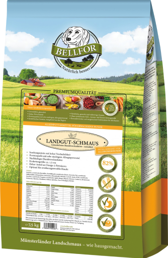 Und diesen Anspruch haben wir auch an unseren Münsterländer Landschmaus, getreidefreies Hundetrockenfutter. Bellfor ist ein Familienbetrieb, der rund 25 Jahre Erfahrung in der Herstellung von Hundefutter besitzt. Wir sind davon überzeugt, dass es jedes Tier verdient, nur qualitativ hochwertiges, natürliches und artgerechtes Hundefutter zu bekommen. Der beste Freund des Menschen soll nicht einfach satt sein, sondern gesund, vital und vor allem glücklich. Darum setzen wir auf ein gesundes, getreidefreies Hundetrockenfutter wie hausgemacht. Dazu gehören für uns: ausschließlich natürliche Zutaten. Hunde sind Semi-Carnivoren aus diesem Grund enthält unser Bellfor Hundefutter um die 70 % Fleisch oder Fisch. Das verwendete Fleisch stammt nicht aus Massentierhaltung, sondern aus artgerechter Tierhaltung von regionalen, langjährigen Partnern und hat Lebensmittelqualität. Unser getreidefreies Hundetrockenfutter enthält viel frisches Obst, Gemüse und wertvolle Kräuter weitgehend aus unserer Region.